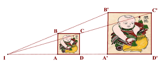 Hai đoạn thẳng `BB'` và `A A'` đồng dạng phối cảnh, điểm `I` là tâm đồng dạng phối cảnh.