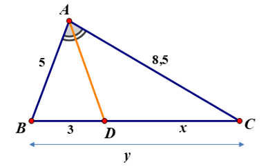 Cho hình vẽ. Biết `AD` là tia phân giác của `hat(BAC)` . Tìm giá trị của `x, y` trên hình.