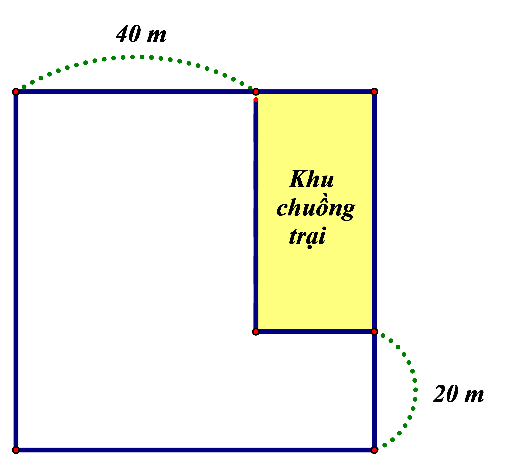 Trong một khu đất có dạng hình vuông, người ta dành một mảnh đất có dạng hình chữ nhật ở góc khu đất để làm chuồng trại. Biết diện tích của khu chuồng trại là `800 m^2`. Hỏi độ dài cạnh của khu đất bằng bao nhiêu mét?