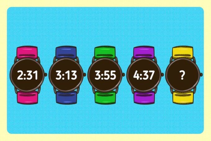 Cho `5` đồng hồ với số chỉ thời gian lần lượt là `2:31`; `3:13`; `3:55`; `4:37`.