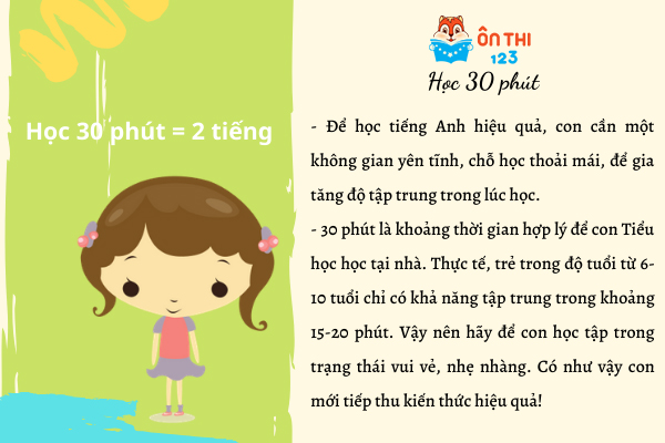 Đã có rất nhiều những nghiên cứu chỉ ra rằng, 30 phút là khoảng thời gian hợp lý để con Tiểu học học tại nhà. Thực tế, trẻ trong độ tuổi từ 6-10 tuổi chỉ có khả năng tập trung trong khoảng 15-20 phút. Vậy nên, cha mẹ đừng ép con học nhiều mà hãy để con vừa học vừa chơi thật thoải mái.