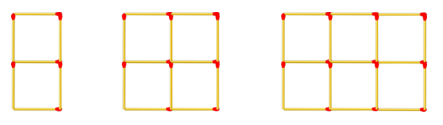 Các que diêm được sắp xếp theo quy luật như hình dưới đây. Hỏi hình thứ `10` được xếp bởi bao nhiêu que diêm?