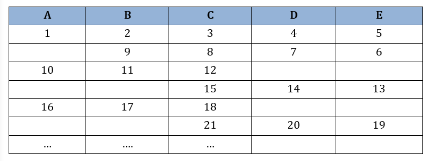 Người ta xếp các số tự nhiên liên tiếp kể từ số `1` thành `5` cột như hình dưới đây. Hỏi số `2022` nằm ở cột nào?