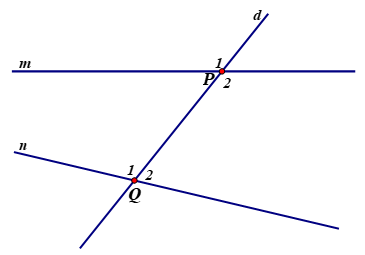 Cho đường thẳng `d` cắt hai đường thẳng phân biệt `m` và `n` lần lượt ở `P` và `Q` (hình vẽ). Khẳng định nào đúng?