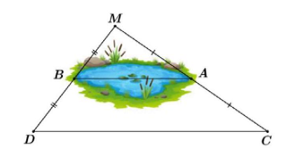 Giữa hai điểm `A,B` là một hồ nước sâu. Biết `A,B` lần lượt là trung điểm của `MC,MD` (xem hình vẽ). Người ta đo được khoảng cách giữa 2 điểm `D` và `C` là `180m`. Hỏi hai điểm `A` và `B` cách nhau bao nhiêu mét?