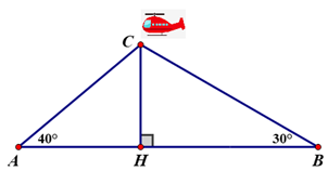 Điểm hạ cánh của một máy bay trực thăng ở giữa hai người quan sát A và B. Biết khoảng cách từ A đến B là `250 m`. Góc nhìn thấy máy bay tạo với mặt đất tại vị trí A là `40^@` và tại vị trí B là `30^@`. Hỏi lúc này máy bay cách mặt đất bao nhiêu mét?