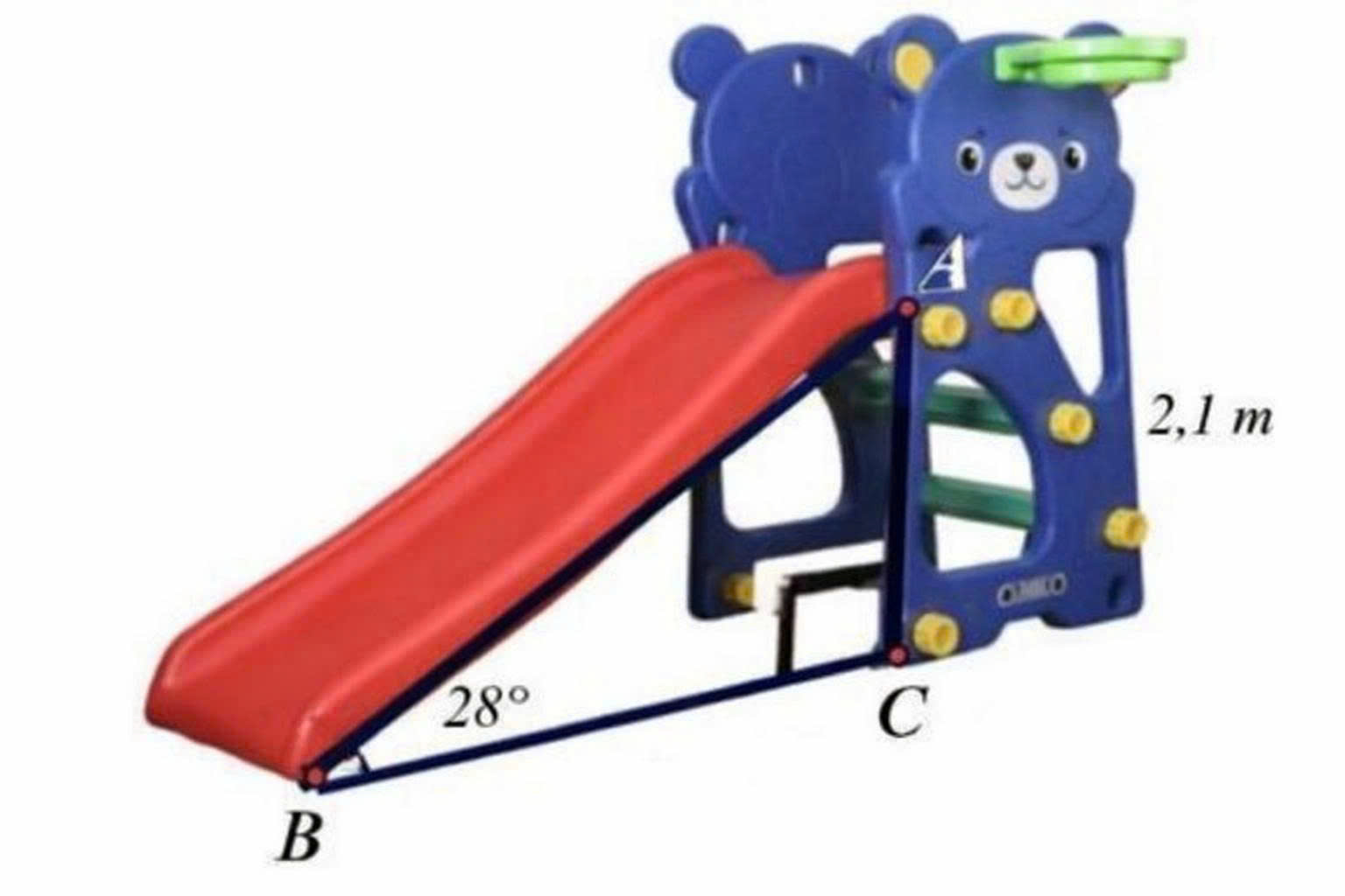 Một cầu trượt trong công viên có độ dốc là `28^@` và có độ cao là `2,1 m`. Độ dài của mặt cầu trượt (Làm tròn kết quả đến hàng phần mười) là: