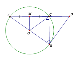 Cho hình vẽ dưới. Biết đường kính `AB = 10cm; OM = 3cm`. Tiếp tuyến tại `B` của đường tròn cắt tia `AC` tại `D`. Tính độ dài `AC, CD`.