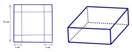 Cho một tấm nhôm hình vuông cạnh `12 cm`. Người ta cắt ở bốn góc của tấm nhôm đó bốn hình vuông bằng nhau, mỗi hình vuông có cạnh bằng `x (cm)`, rồi gập tấm nhôm lại (như hình vẽ bên dưới) để được một cái hộp không nắp.