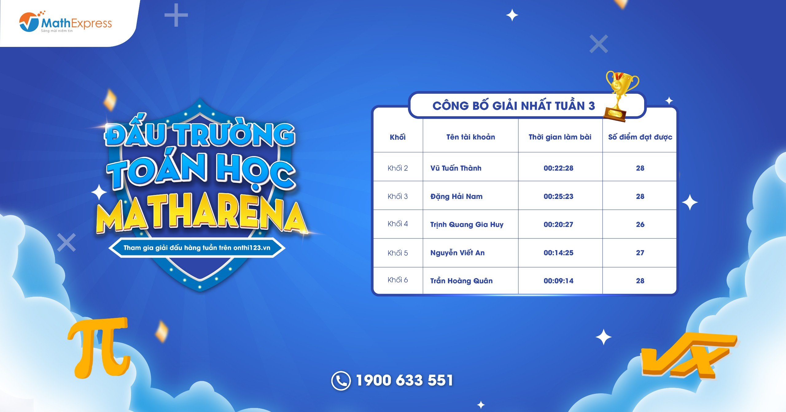 MathExpress xin chúc mừng các bạn thí sinh đã đạt giải Nhất Tuần vòng đấu thứ 3. Thành tích xuất sắc này là một minh chứng cho sự tài năng, sự nỗ lực và quyết tâm của các em trong việc chinh phục các thử thách Toán học tại MathArena. Theo thể lệ của cuộc thi, những bạn đạt giải Nhất Tuần sẽ nhận được 1 thẻ VIP 1 tháng sử dụng onthi123. CLB sẽ sớm liên hệ với Phụ huynh và các em để trao giải.