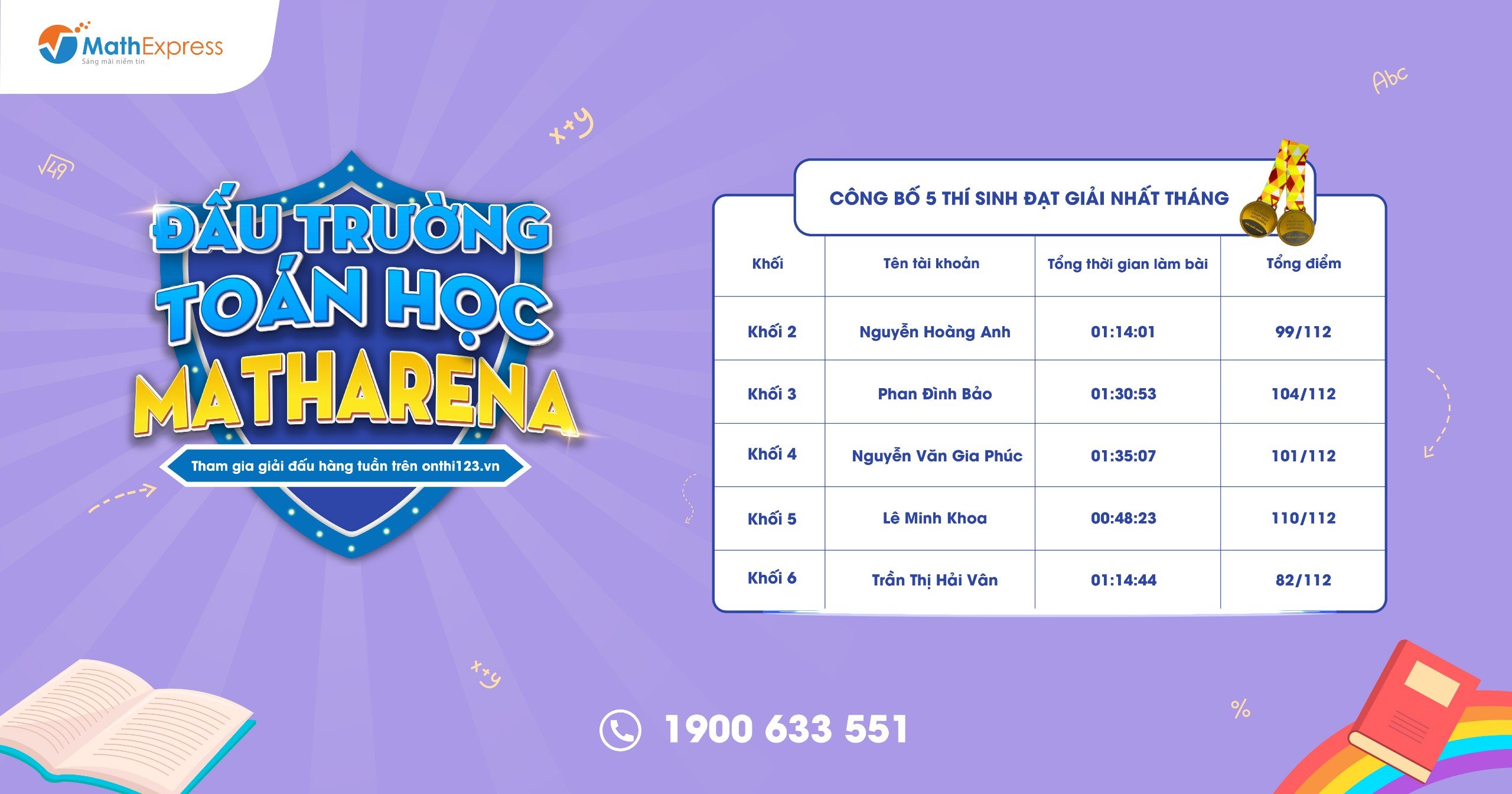 Chúng tôi xin chân thành cảm ơn Quý Phụ huynh và các em đã dành sự quan tâm tới đấu trường Toán học – MathArena. MathExpress hy vọng “sân chơi tri thức” MathArena đã mang đến những cuộc đua thú vị với những trải nghiệm mới mẻ, giúp các em rèn luyện kỹ năng giải Toán và hy vọng chúng tôi sẽ tiếp tục nhận được sự ủng hộ của mọi người trong những cuộc thi khác trong năm học tới.