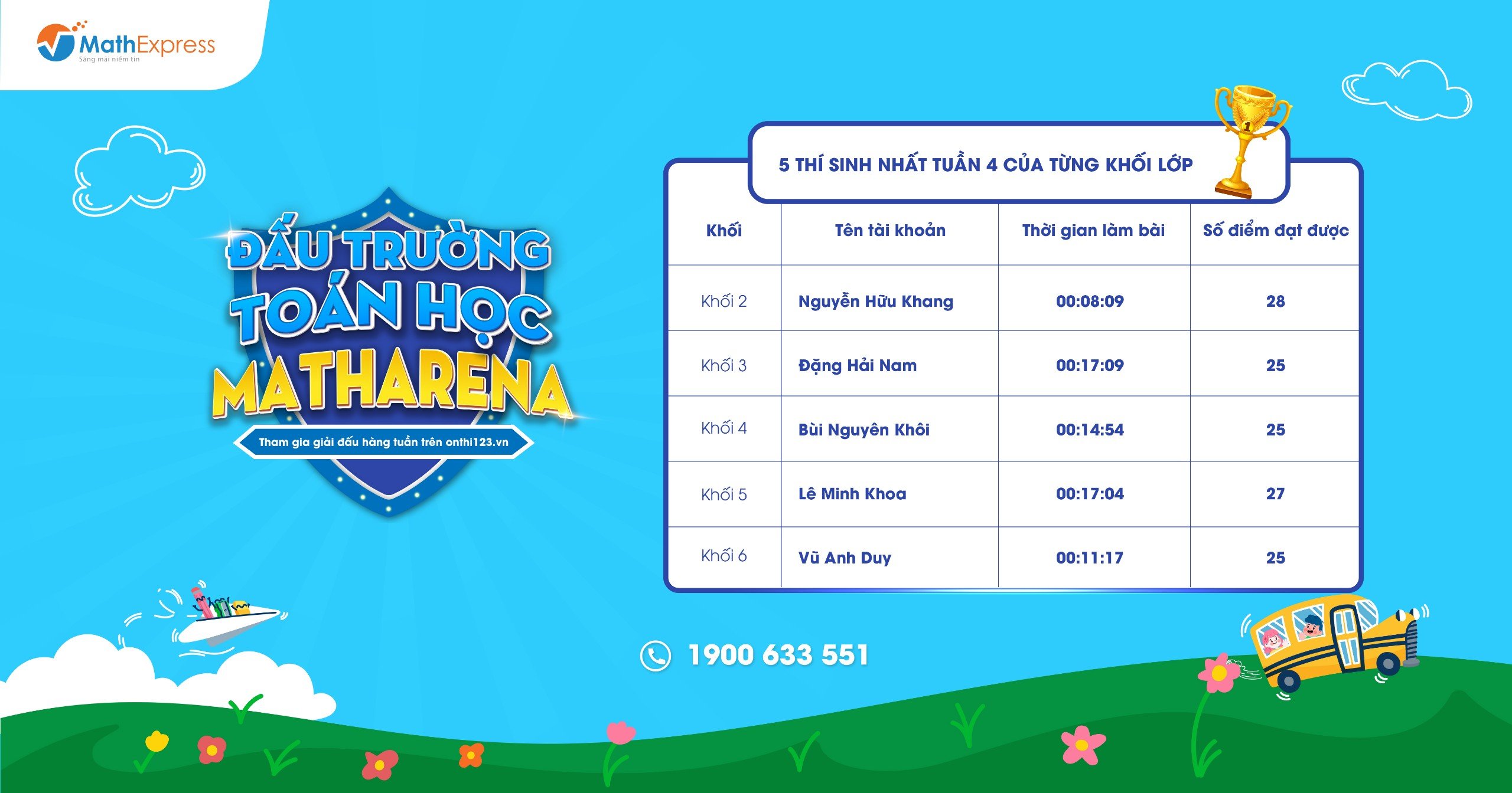 Trận 4 đấu trường Toán học – MathArena tháng 03/2024 đã khép lại vào tối ngày 23/03 vừa qua với sự tham gia của gần 100 học sinh các khối 2, 3, 4, 5, 6. Sau một trận đấu gay cấn, MathExpress xin công bố 5 thí sinh xuất sắc vượt qua hàng chục đối thủ, vươn lên giành vị trí đầu bảng với thành tích rất ấn tượng ở bài viết sau đây.