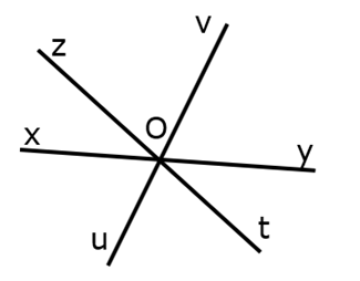 Gọi `O` là giao điểm của ba đường thẳng `xy, zt` và `uv`. Có bao nhiêu góc bẹt đỉnh `O` ?