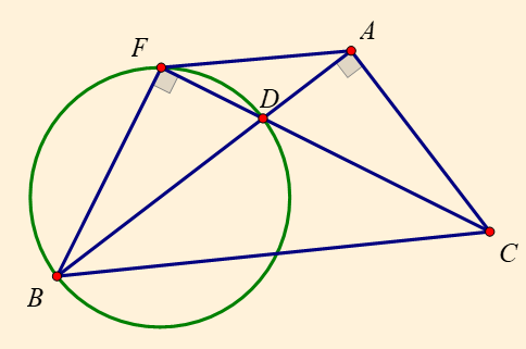 Xét tứ giác `ACBF` có: `hat(BAC)=hat(BFC)=90^o`, mà hai đỉnh `A` và `F` kề nhau cùng nhìn cạnh `BC`
