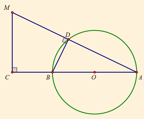 Cho đường tròn đường kính `AB` và `D` là một điểm thuộc đường tròn (`D` khác `A` và `B`). Trên tia đối của tia `BA` lấy một điểm `C`. Đường thẳng vuông góc với `BC` tại `C` cắt đường thẳng `AD` tại `M`. Tứ giác `MCBD` là tứ giác nội tiếp là đúng hay sai?