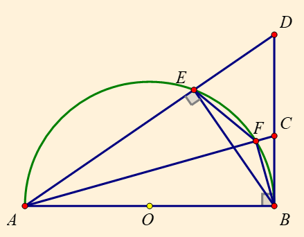 Cho nửa đường tròn `(O)` đường kính `AB`. Trên tiếp tuyến tại `B` của nửa đường tròn, lấy các điểm `C` và `D` (`BC < BD`). Các tia `AC` và `AD` cắt nửa đường tròn theo thứ tự tại `F` và `E` (khác `A`).