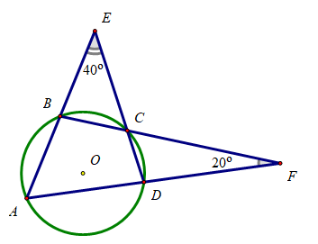Sử dụng tính chất góc ngoài của tam giác và định lý tổng hai góc đối của tứ giác nội tiếp bằng `180^o`