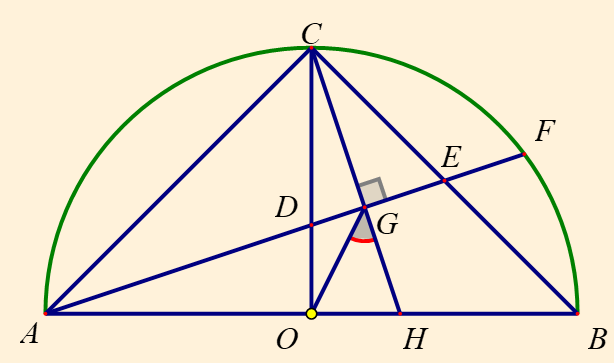 Cho nửa đường tròn tâm `(O)`, đường kính `AB=2R`. Đường thẳng qua `O` và vuông góc `AB` cắt cung `AB` tại `C`. Gọi `E` là trung điểm `BC`. `AE` cắt nửa đường tròn `O` tại `F`. Đường thẳng qua `C` và vuông góc `AF` tại `G` cắt `AB` tại `H`. Khi đó góc `hat(OGH)` có số đo là: