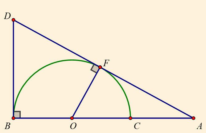 Cho nửa đường tròn `(O;R)` đường kính `BC`. Lấy điểm `A` trên tia đối của tia `CB`. Kẻ tiếp tuyến `AF`, `Bx` của nửa đường tròn `(O)` (với `F` là tiếp điểm). Tia `AF` cắt tia `Bx` của nửa đường tròn tại `D`. Khi đó tứ giác `OBDF` là: