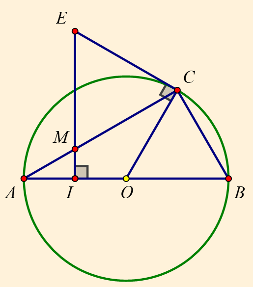 Cho tam giác `ABC` nội tiếp đường tròn `(O)` đường kính `AB`. Đường thẳng vuông góc với `AO` tại trung điểm `I` của `AO` cắt `AC` tại `M` và cắt tiếp tuyến tại `C` của đường tròn tại `E`. Cho `sđoverset(frown)(AC)=120^o`.
