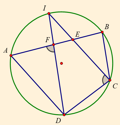 Cho tứ giác `ABCD` nội tiếp trong đường tròn `(O),I` là điểm chính giữa cung `AB` (không chứa `C` và `D`). `IC,ID` cắt `AB` tương ứng tại `E` và `F`. `hat(CDI)` bằng góc nào sau đây?