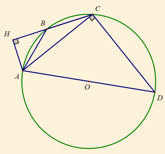 Kẻ đường kính `AD` của `(O)`, dựa vào tính chất tứ giác nội tiếp `ABCD` để chứng minh `△ABHᔕ△ADC` từ đó tính độ dài cạnh `AD=2R`