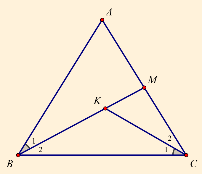 Cho tam giác `ABC` cân tại `A`. Trên cạnh `AC` lấy điểm `M`, trên đoạn thẳng `BM` lấy điểm `K` sao cho `hat(BCK)=hat(ABM)`. Tam giác `MBC` đồng dạng với tam giác