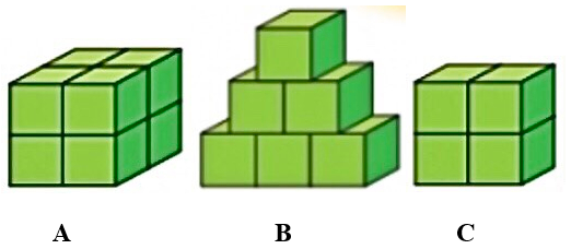 Cho `3` khối A, B, C như hình vẽ. Các khối này được ghép bởi các khối lập phương lại với nhau. Hỏi khối nào được ghép bởi ít khối lập phương nhất?