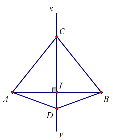 Cho đoạn thẳng `AB`. Qua trung điểm `I` của `AB` vẽ đường thẳng `xy` vuông góc với `AB`. Trên `xy` lấy `2` điểm `C, D` (khác với `I`). Nối `CA,CB, DA và DB`. Hỏi `triangleACD` và `triangleBCD` có bằng nhau không?