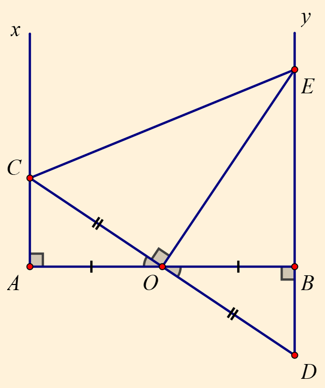 Cho đoạn thẳng `AB` và `O` là trung điểm của `AB`. Trên cùng một nửa mặt phẳng bờ `AB` vẽ các tia `Ax, By` vuông góc với . Lấy `C` bất kì thuộc tia `Ax, C` khác `A`. Tia `CO` cắt tia đối của tia `By` tại `D`. Đường thẳng vuông góc với `CO` tại `O` cắt tia `By` ở `E`.