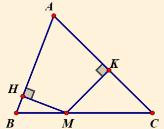 Cho tam giác `ABC`, điểm `M` nằm giữa `B` và `C`. Gọi `H` và `K` là chân các đường vuông góc kẻ từ `M` đến các đường thẳng `AB` và `AC`. So sánh `BC` và tổng `MH + MK`