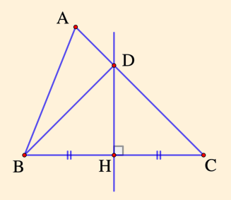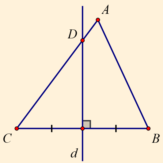 Nếu đường trung trực d của cạnh `BC` của `triangle ABC` cắt cạnh `AC` tại điểm `D` nằm giữa `A` và `C` thì khẳng định nào sau đây là đúng: