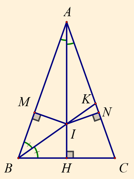 Cho tam giác `ABC` cân tại `A`. Kẻ `AH` vuông góc với `BC`. Gọi `BK` là phân giác của tam giác `ABC` `(K` thuộc `AC)`, `BK` cắt `AH` tại `I`. Kẻ `IM`, `IN` vuông góc với `AB`, `AC (M`, `N` thuộc `AB`, `AC)`.