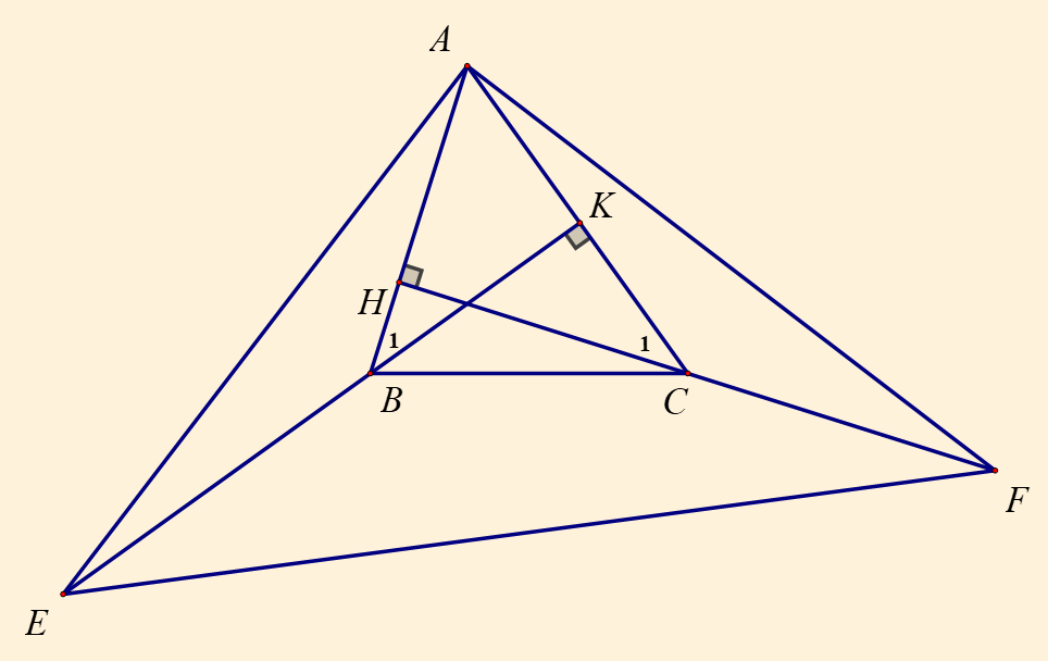 Tam giác `ABC` có góc `A` nhọn, kẻ đường cao `BK` và `CH`. Trên tia đối của tia `BK` lấy điểm `E` sao cho `BE = AC`, trên tia đối của `CH` lấy điểm `F` sao cho `CF = AB`.