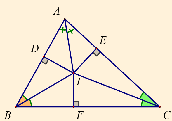 `=>`điểm `I` cách đề ba cạnh của `triangleABC` hay `ID=IE=IF(`tính chất`)`
