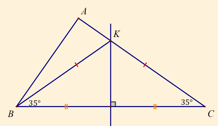 Cho tam giác `ABC` vuông tại `A`, `hatC = 35^o`. Đường trung trực của cạnh `BC` cắt `AC` tại `K`.