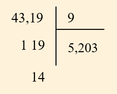 Dóng thẳng cột dấu phẩy ở số bị chia xuống vị trí của số dư ta tìm được số dư là `0`,`14`