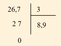 Vậy `26`,`7 : 3 = 8`,`9`.