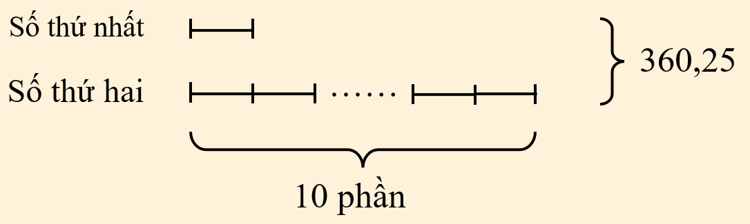 Tìm hai số thập phân có tổng bằng `360`,`25` biết rằng nếu dời dấu phẩy của số thứ nhất sang bên phải một chữ số ta sẽ được số thứ hai