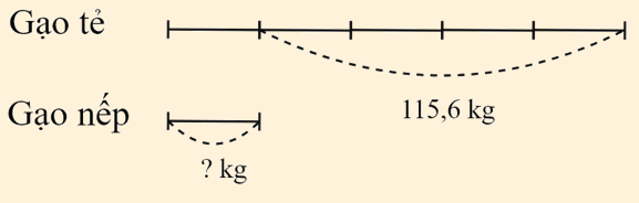 Một cửa hàng có số gạo tẻ nhiều hơn gạo nếp là `115`,`6kg`. Sau khi bán đi `13`,`5kg` mỗi loại thì số gạo tẻ còn lại gấp `5` lần số gạo nếp còn lại.