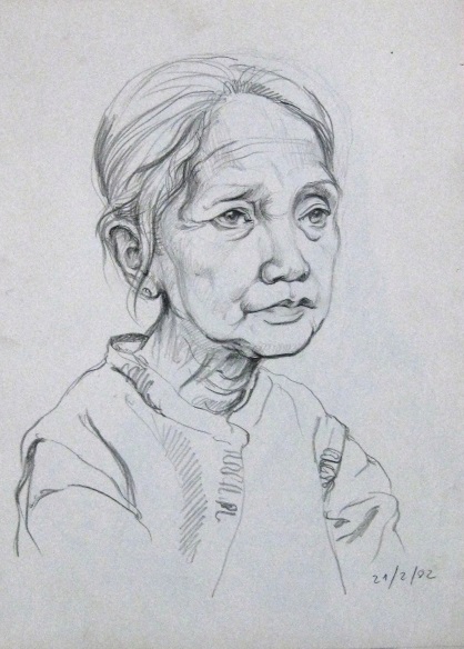 Khuôn mặt thanh tú của in đầy các vết nhăn của thời gian và sự lo âu, vất vả.