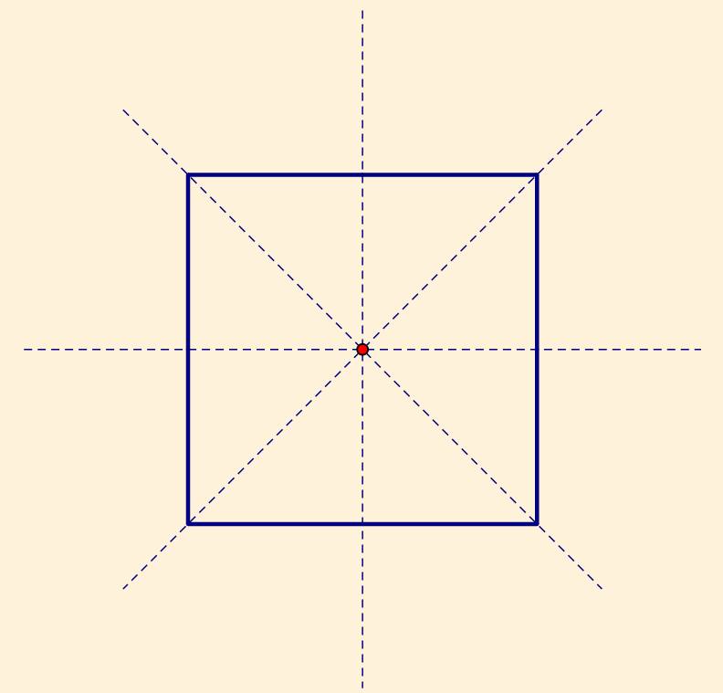 Hình vuông có một tâm đối xứng là giao điểm hai đường chéo, có bốn trục đối xứng: hai đường chéo và hai đường thẳng nối trung điểm các cạnh.