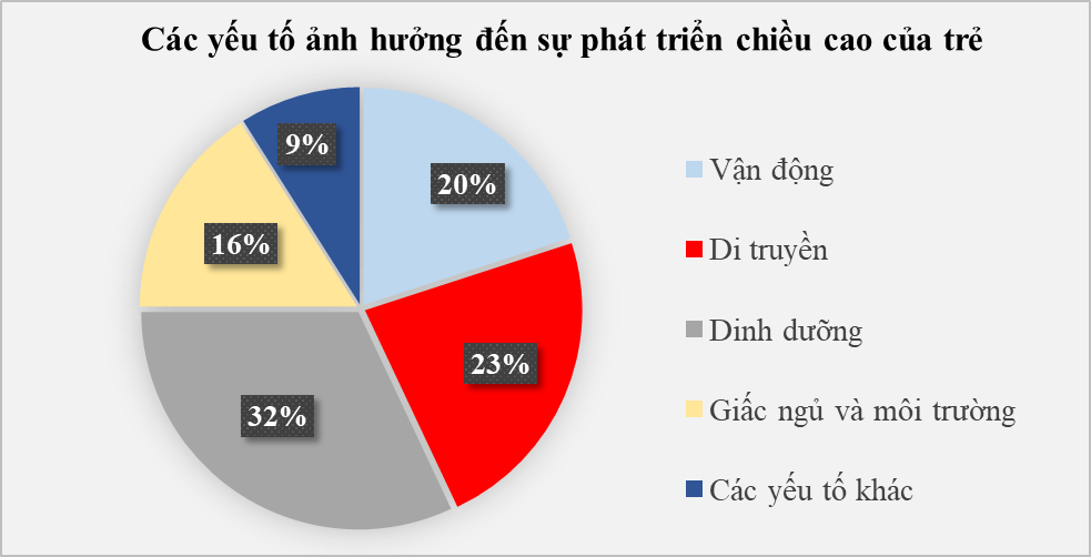 Từ biểu đồ trên hãy cho biết yếu tố Vận động và Dinh Dưỡng ảnh hưởng bao nhiêu phần trăm đến sự phát triển chiều cao của trẻ?