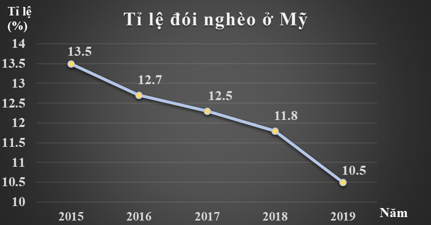 Từ biểu đồ ta thấy tỉ lệ đói nghèo tính trên tổng dân số của Mỹ trong năm `2019` là `10`,`5%`