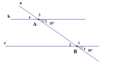 Cho đường thẳng `a` cắt hai đường thẳng `b,c`. Trong các góc tạo thành từ `a,b,c` có một cặp góc đồng vị bằng nhau với số đo bằng `35^o` như hình vẽ. Hãy chọn đáp án đúng nhất.