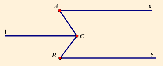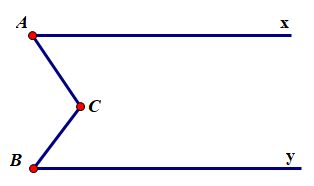 Cho hình vẽ, biết `x////y` và số đo `hat(ACB)=135^o` và `hat(CBy)=70^o`.
