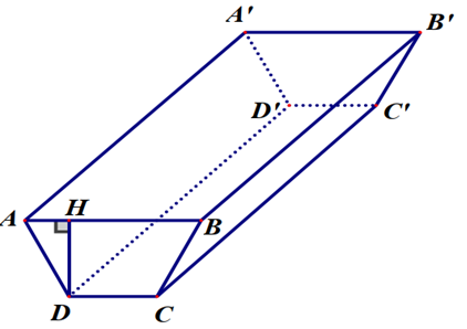 Tính thể tích của bồn tắm có dạng hình lăng trụ đứng, đáy là hình thang cân. Biết `A A’ = 4` `m` ; `AB = 2` `m` ; `CD = 1` `m` ; `DH = 1` `m`