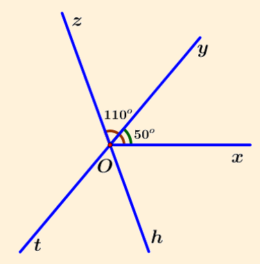 Trên cùng một nửa mặt phẳng bờ chứa tia `Ox` vẽ các tia `Oy,Oz` sao cho `hat(xOy)=50^o, hat(xOz)=110^o`. Gọi `Ot` là tia đối của tia `Oy,Oh` là tia đối của tia `Oz.`