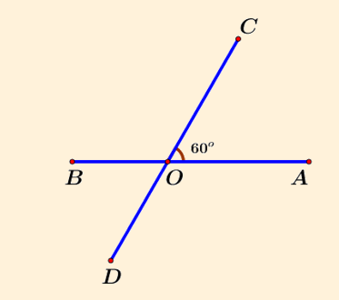 Vẽ hai đường thẳng `AB` và `CD` cắt nhau tại `O.` Biết `hat(AOC)=60^o`.