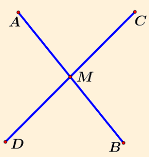 Vì hai đường thẳng `AB` và `CD` cắt nhau tại `M` nên `hat(AMB)` và `hat(CMD)` là hai góc bẹt